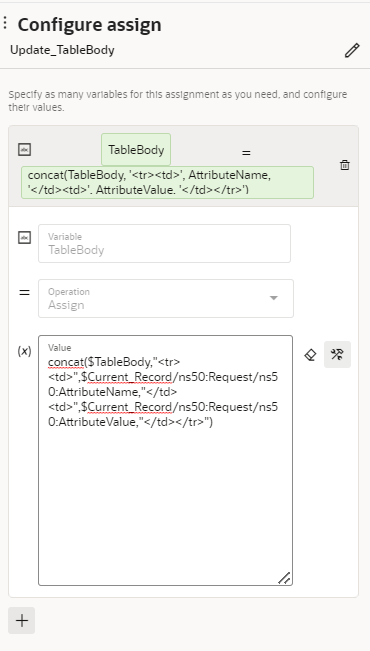 concat($TableBody,"<tr><td>",$Current_Record/ns50:Request/ns50:AttributeName,"</td><td>",$Current_Record/ns50:Request/ns50:AttributeValue,"</td></tr>")For each Iteration this assign activity will concat the data of the previous iteration with the current one and hence we will get a new row for each iteration.