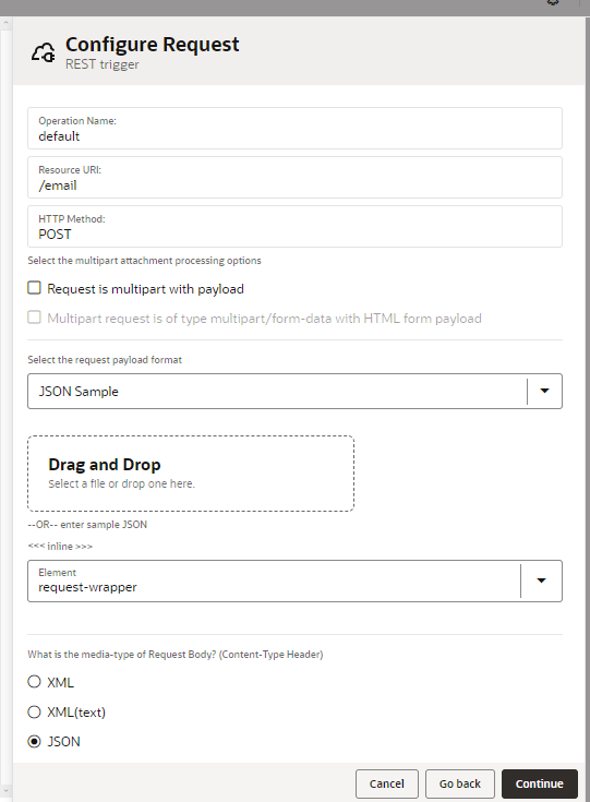 Step2: Add a REST Connection as the Trigger and configure it as a one way call( as we don’t want the response but want an email notification)